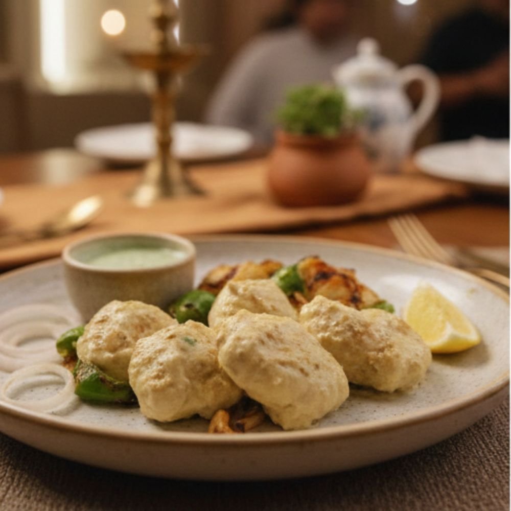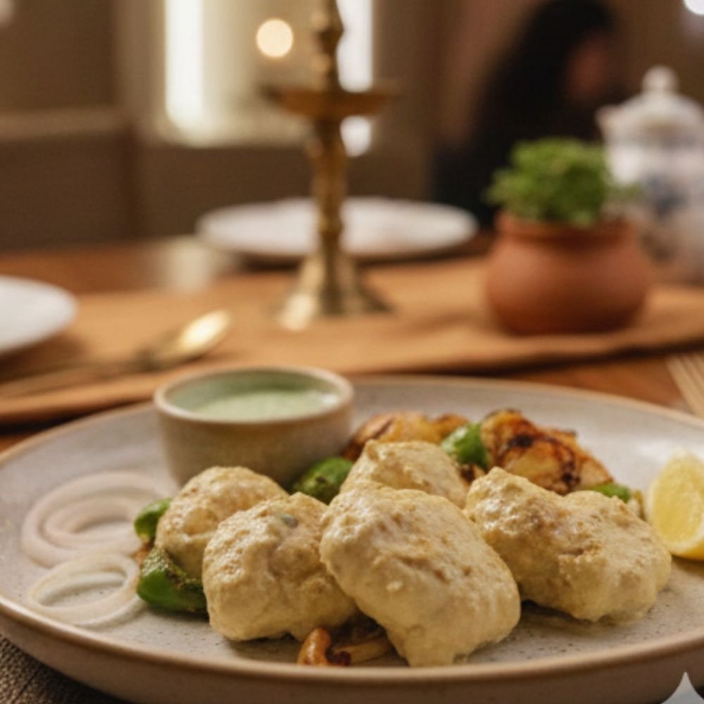 Afghani Chaap is a rich and creamy appetiser made from tender soya chaap marinated in fresh cream, yogurt, and mild spices, then grilled until lightly charred. Smooth, smoky, and indulgent, it’s served with mint chutney and lemon.