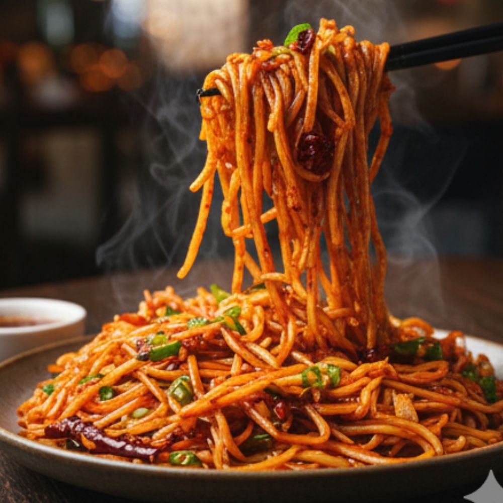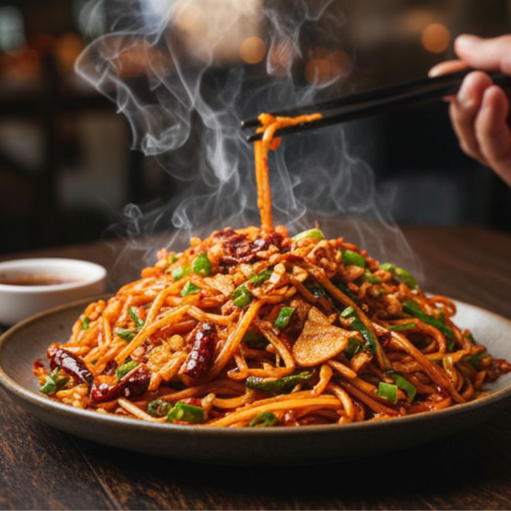 Generous garlic and red chillies are sautéed to release a strong aroma, creating a spicy, savoury base for the noodles.