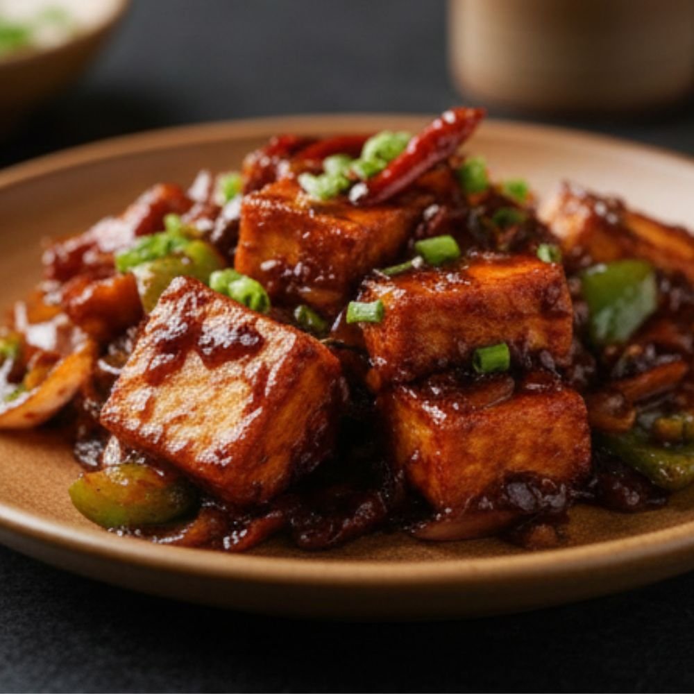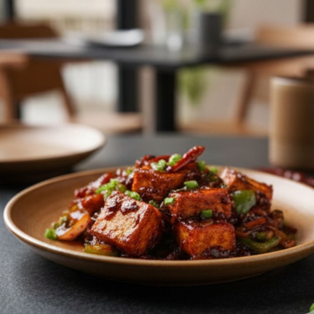 The paneer is tossed in a wok with garlic, soy sauce, chilli paste, onions, and capsicum, creating a bold balance of heat, tang, and savoury flavours.