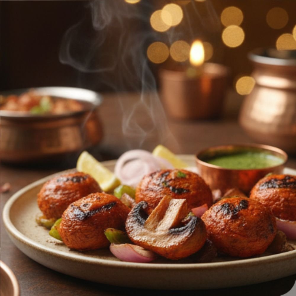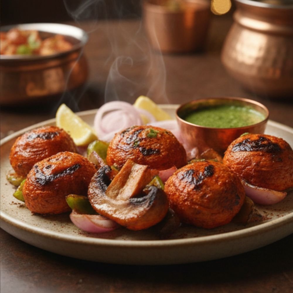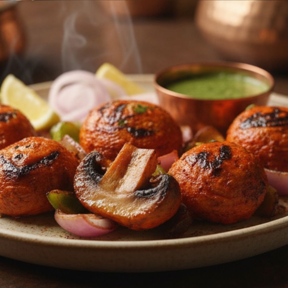 Grilled until lightly charred, Mushroom Tikka is served hot with refreshing mint chutney, sliced onions, and lemon wedges, making it a delicious vegetarian starter.