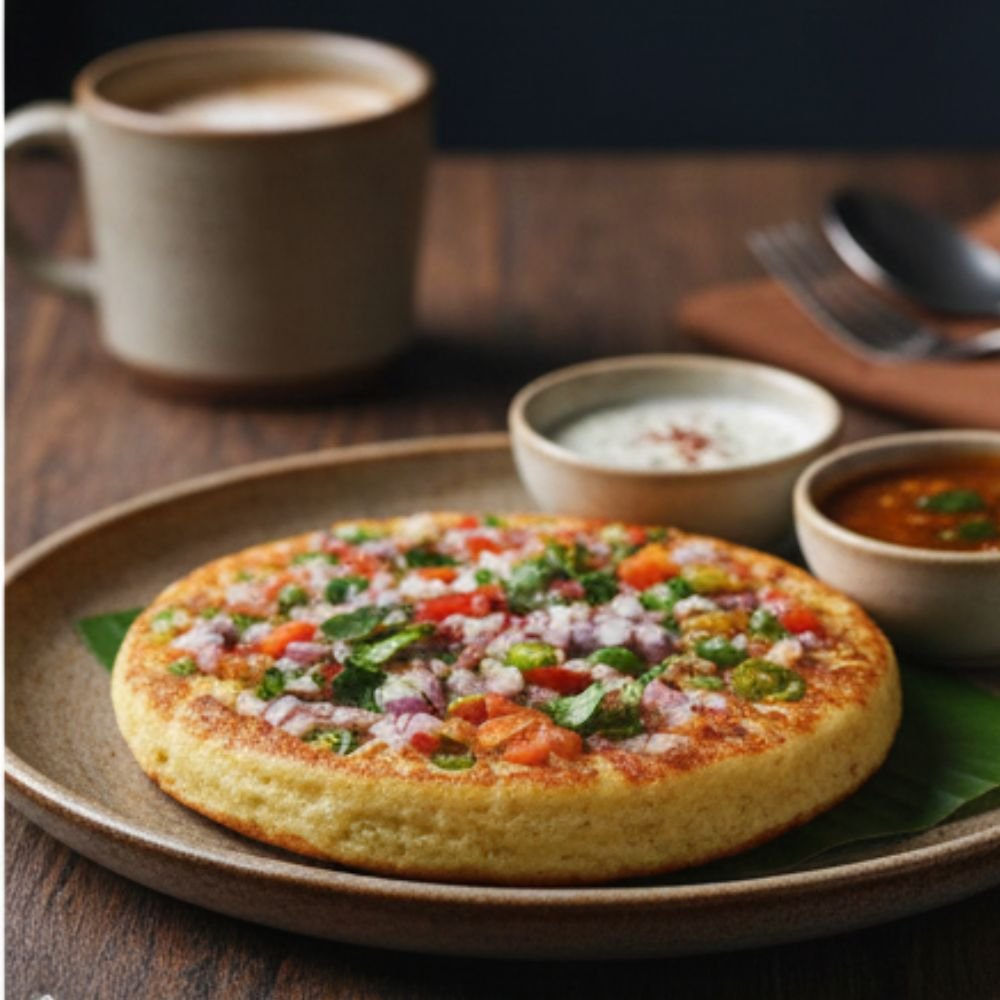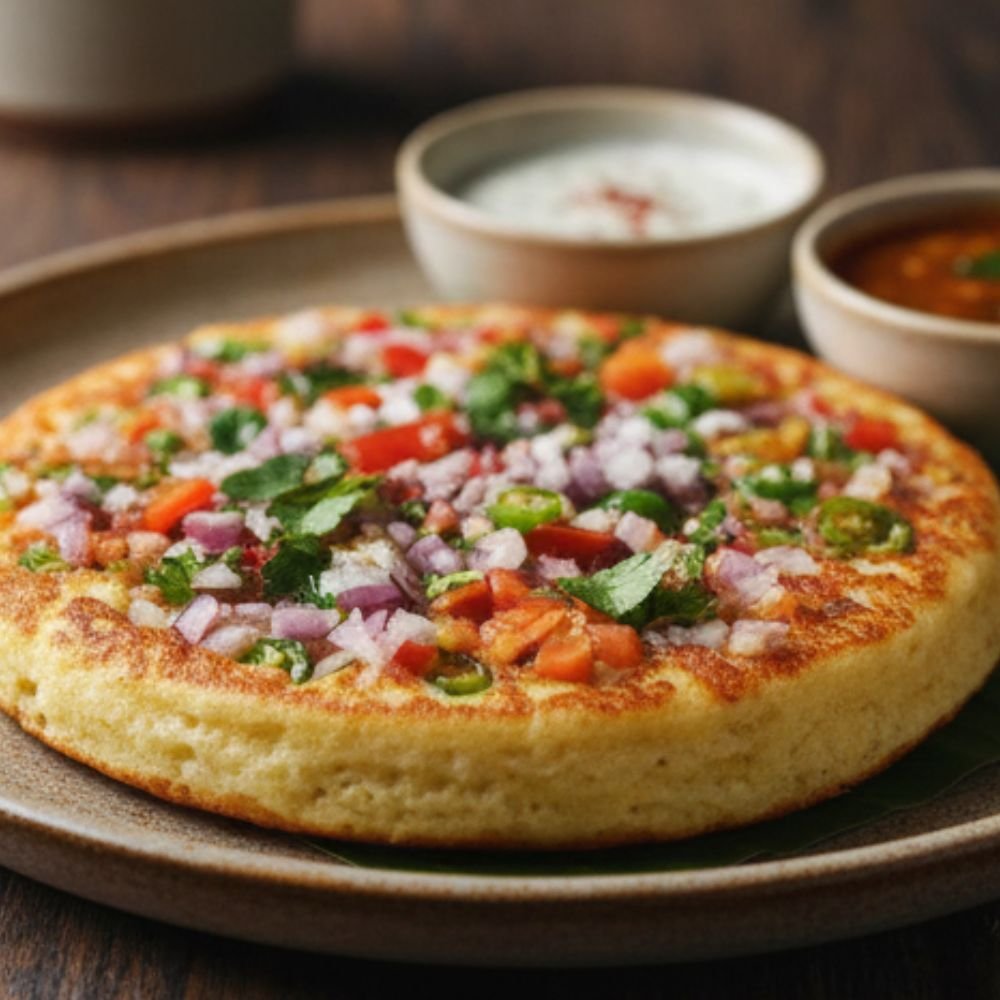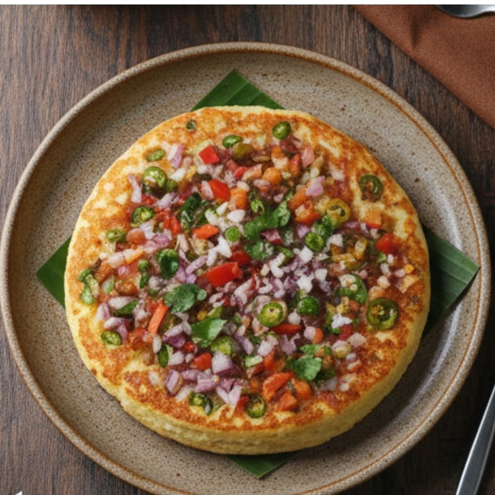 Onion Uttapam is prepared from a naturally fermented rice and lentil batter, cooked thicker than a dosa to create a soft, spongy texture with a lightly crisp surface.