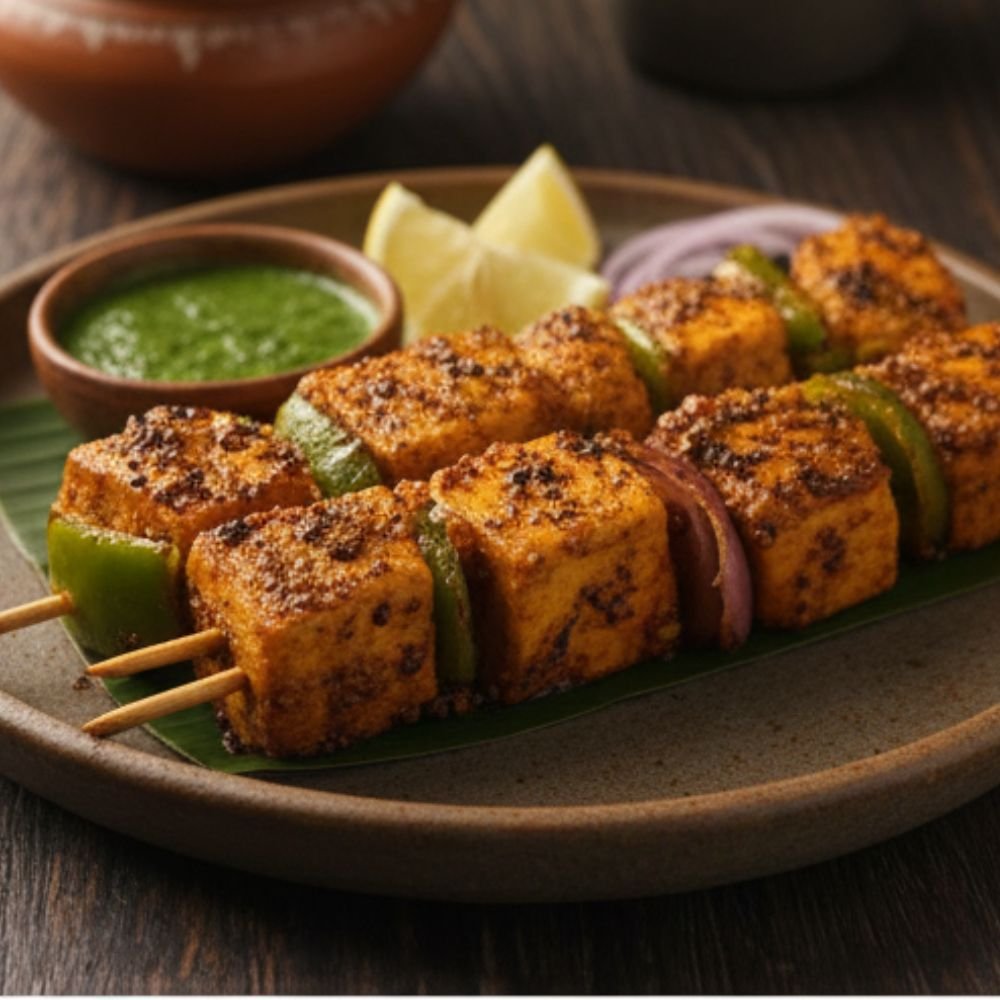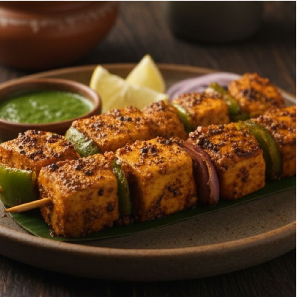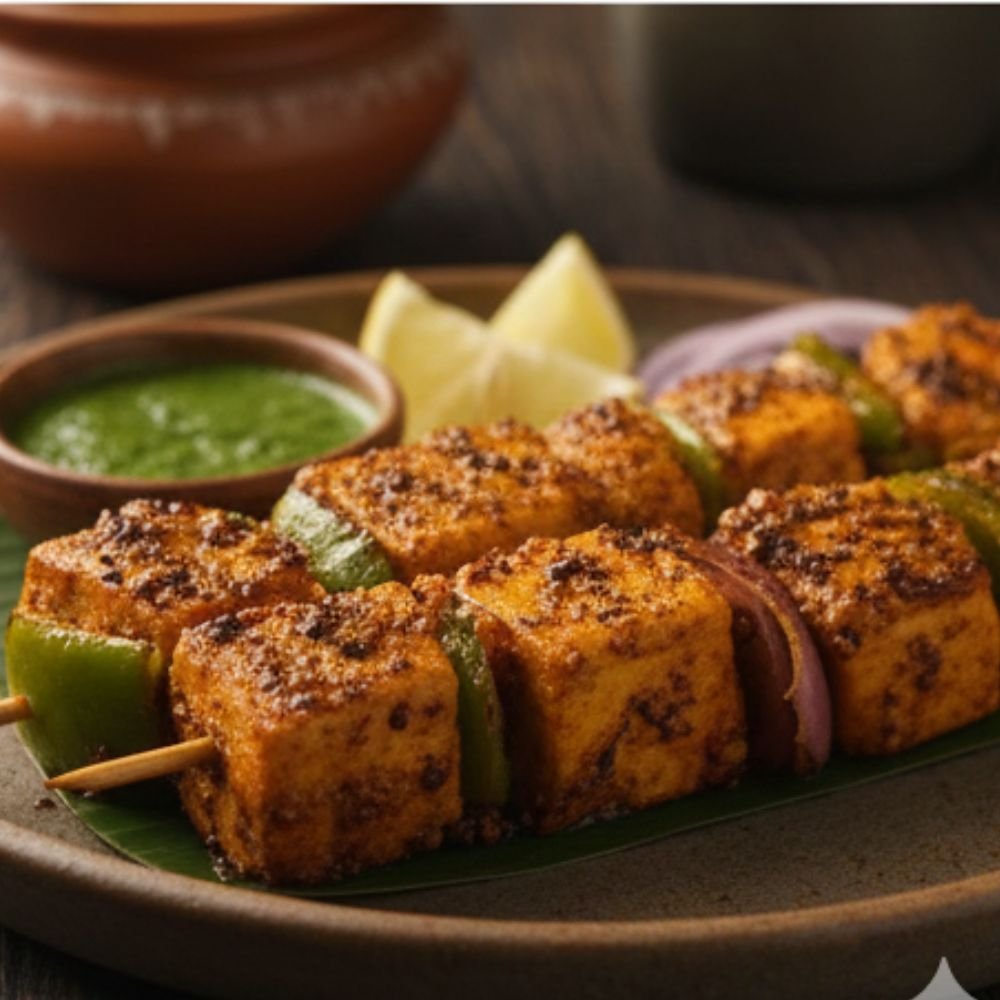 Paneer Tikka Achari is a bold and flavourful appetiser featuring soft paneer cubes marinated in tangy achari spices and yogurt, then grilled to smoky perfection. Rich, aromatic, and slightly spicy, it’s served with mint chutney and lemon.