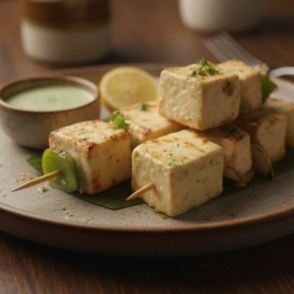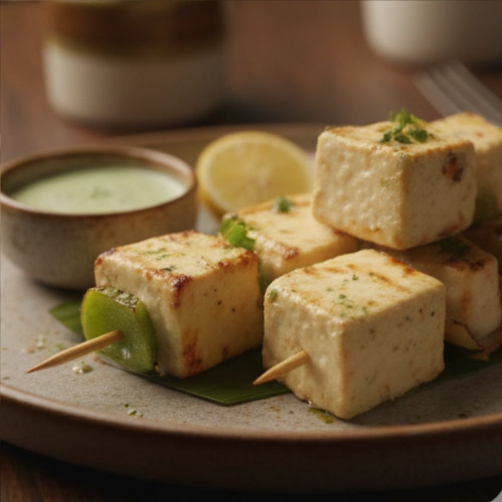 Fresh Paneer cubes are marinated to retain their softness while achieving a melt-in-the-mouth texture after grilling.