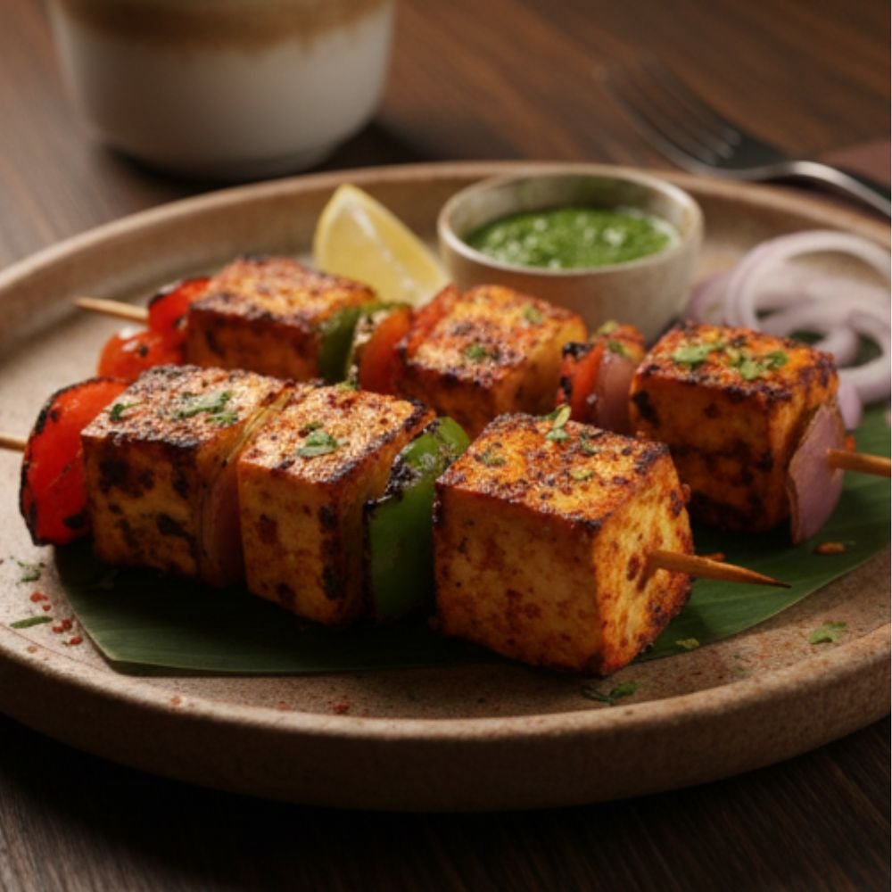 The paneer is coated in a blend of thick yogurt, traditional spices, herbs, and mild heat, then grilled to perfection to create a smoky, charred exterior.