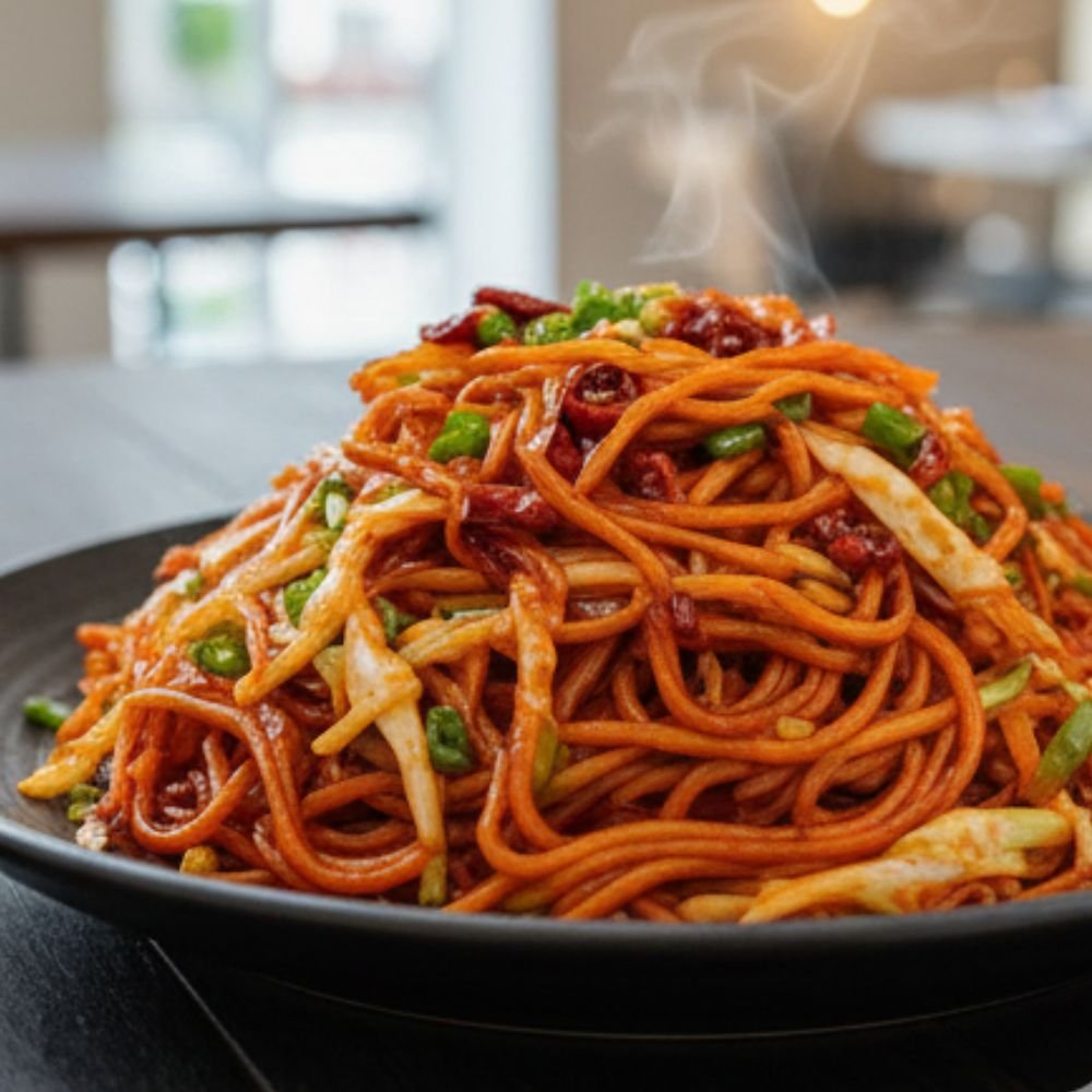 The noodles are tossed in a flavourful Schezwan sauce made with red chillies, garlic, and spices, delivering a fiery kick and deep savoury notes.